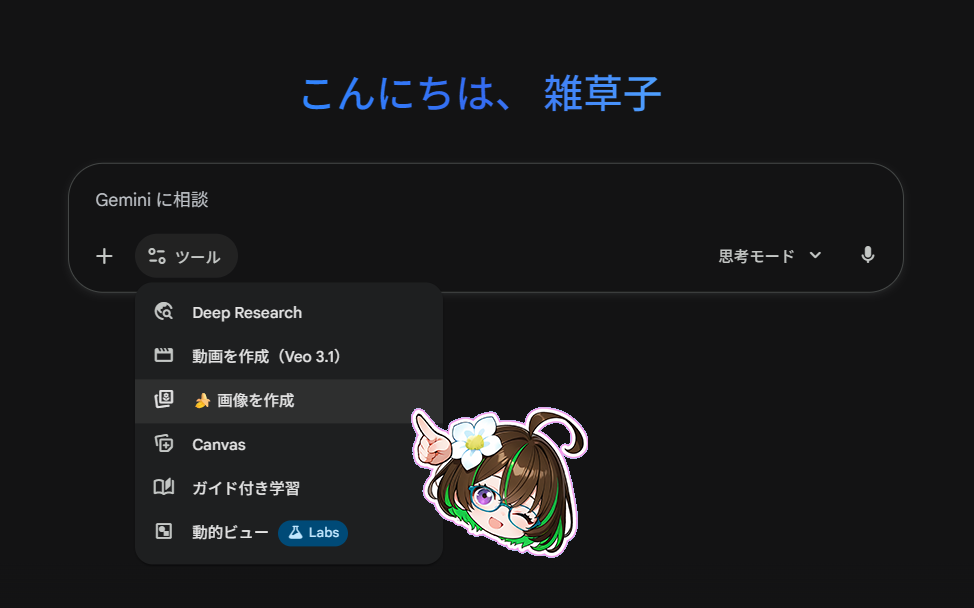 - Geminiアプリ(Web/Android/iOS)→「画像を作成」「思考モード」